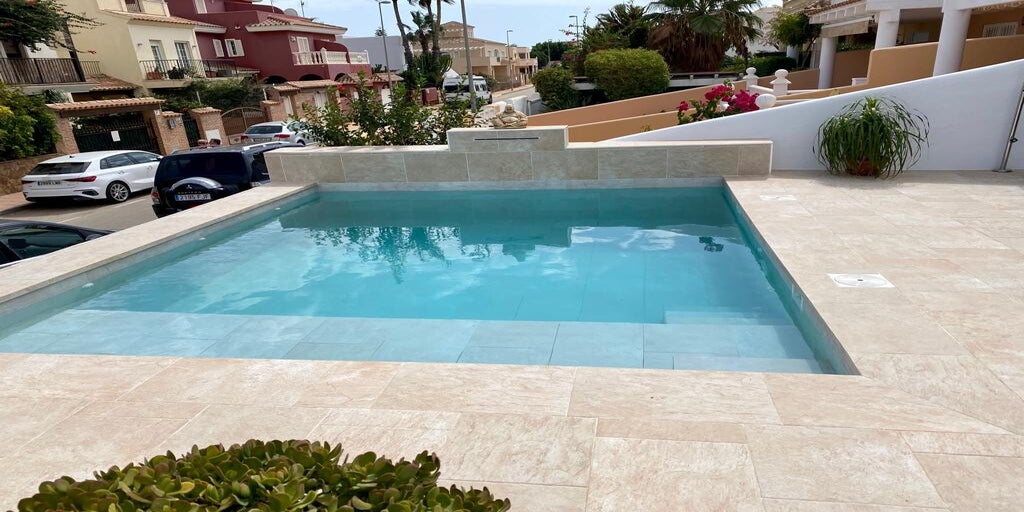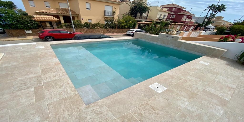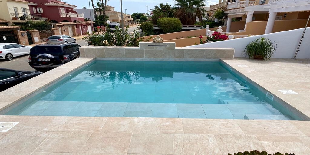 Swimming pool done in modern large tiles, easier to clean and maintain in the future.